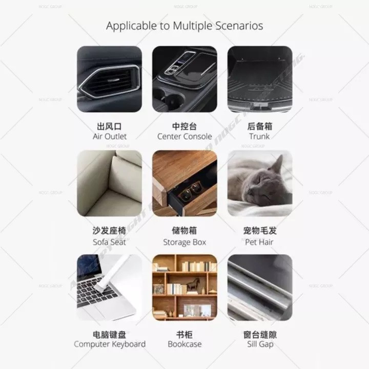 دارای یک سری بلند نازل جهت تمیز کردن گوشهها، نقاط کور داخل ماشین و محلهای غیر دسترس، یک برس برای تمیز کردن شیارها مانند دریچه کولر و یک سری جهت اتصال به قسمت خروجی باد جهت افزایش قدرت دمیدن، کابل شارژ تایپ سی
